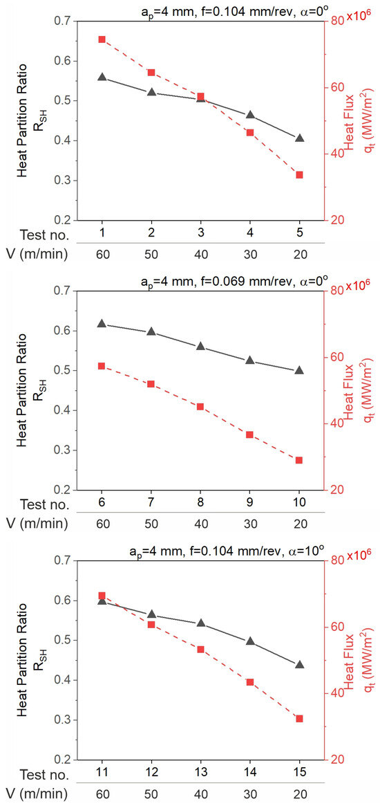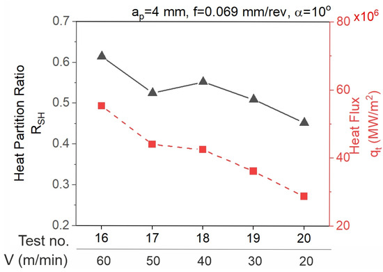 - The heat partition ratio for the tool (1-RSH) decreases as the cutting speed increases. The greatest value of the ratio was determined in test 5 (0.596) and the smallest value in test 6 (0.383).