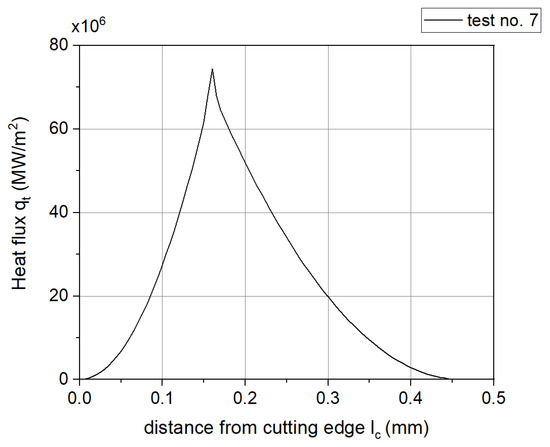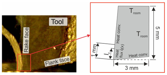- Heat flux propagation was considered only on the rake face, within the chip–tool contact area, according to Figure 17;