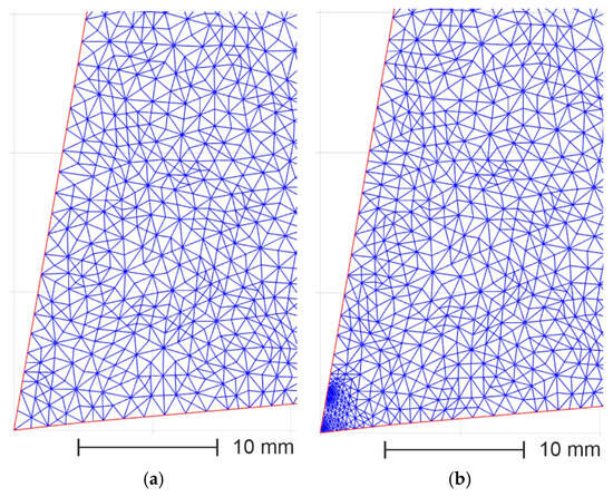Figure 18 presents the cutting tool geometries with the superimposed FEM mesh before and after adaptation. The mesh densification in the chip–rake face contact place was implemented by modification of the mesh Hgrad parameters.