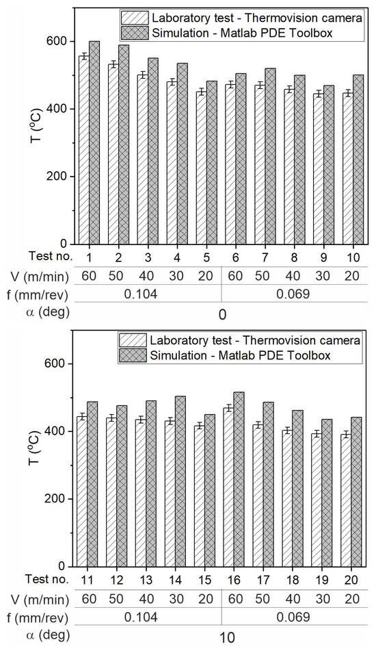 Examples of the thermograms presenting the temperature distribution on the cutting tool surface, obtained with the MATLAB PDE Toolbox for test No. 1 (α = 0°) and test No. 7 (α = 10°) are shown in Figure 19 below.