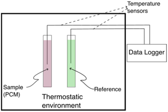 As discussed in Section 1, the T-history method provides a more effective approach for characterizing salt hydrates than DSC. This method involves placing the PCM and reference material into separate test tubes, each equipped with a temperature sensor positioned at the tube’s center. Initially, both tubes are maintained at thermal equilibrium within a controlled environment. Subsequently, they are simultaneously exposed to a different ambient temperature, allowing each material to equilibrate with its surroundings over a predefined duration. Figure 2 illustrates a general schematic of the T-history experimental setup.