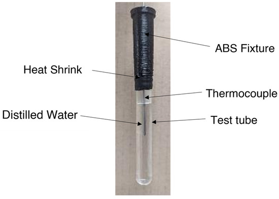 Initially, the mixture was frozen at −4 °C in a freezer for 10 h and subsequently crushed into a fine powder using a mixer to ensure homogeneity. The ground mixture was then melted at 40 °C for 10 h in a forced convection oven, sealed in a polyethylene bag to prevent moisture loss. Before loading it into test tubes, the PCM was vigorously mixed to ensure uniformity. Samples were maintained at 40 °C during transfer to the test tubes. After loading the PCM, the test tubes were sealed using a heat-shrink material and secured with a fixture that held the thermocouples and the test tube together. The reference test tube with distilled water is illustrated in Figure 3.