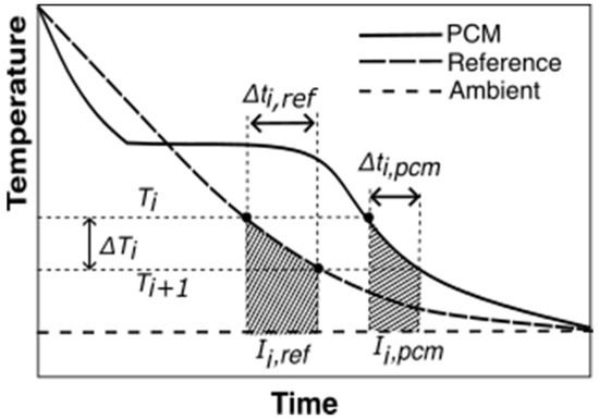 where is the average PCM temperature of the interval under study. and are the area under the PCM and reference temperature curves, respectively, calculated using Equations (7) and (8).