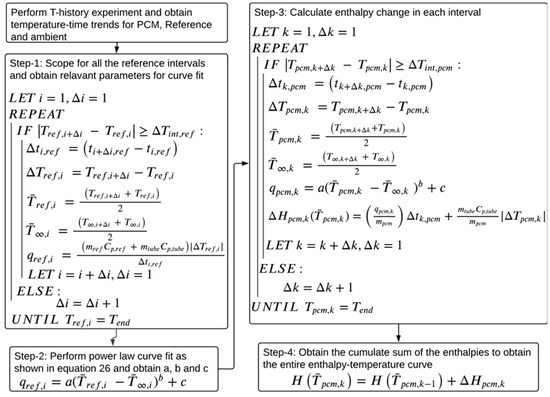 Step 3: Obtain PCM temperature intervals using . Similar to step 1, obtain and the average PCM and ambient temperatures, and , respectively, for each interval using the trapezoid rule. Then, for each interval, compute the PCM heat transfer rate, , using and the power law curve fit parameters obtained in step 2, as shown in Equation (17). Compute the enthalpy change for each PCM interval using Equation (18). The absolute value of is used to follow an assumption that the heat released in the PCM during the supercooling process and heat transferred to the ambient are the same.