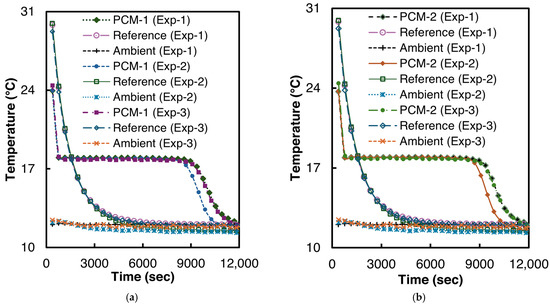 Temperature vs. time curves for n-Hexadecane solidification (a) PCM-1, (b) PCM-2.
