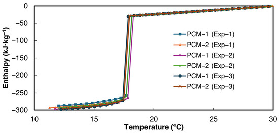 The enthalpy–temperature curves obtained using the power law curve fit method proposed in this paper are shown in Figure 8. For the validation studies, the minimum allowed temperature interval 0.2 °C was used. For the enthalpy temperature curve, 30 °C was chosen as a reference for zero enthalpy. The enthalpy–temperature curves demonstrate close agreement with each other.
