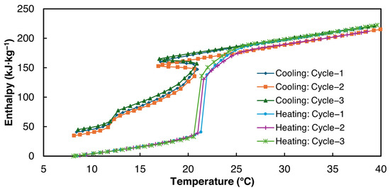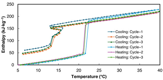 Two composites of SSD, 1E-3SPA and 2E-3SPA, were characterized in this study. 1E-3SPA and 2E-3SPA contain 12 wt.% and 9 wt.% NaCl, respectively, as listed in Table 4. Both composite compositions have the same content of nucleator (4 wt.% borax) and thickener (3 wt.% SPA). As per the guidelines in RAL standards [36], three samples of each composite were tested, each sample was cycled three times, and enthalpy–temperature curves for the third cycle were reported.