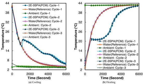 The solidification experiments were performed at ambient temperatures of 11–12 °C. Two samples of n-Hexadecane were prepared for the experiment, each with 6.3 g of n-Hexadecane. To ensure repeatability, both samples were tested thrice. Before the start of every test, both reference and PCM test tubes were placed in a thermostatic bath at 40 °C for at least six hours to reach thermal equilibrium. The T-history curves of the solidification experiments are illustrated in Figure 7.