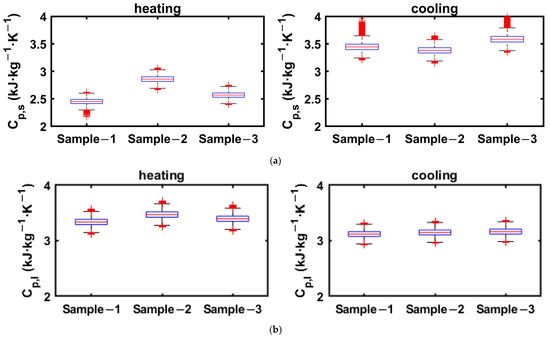 Sandnes and Rekstad [33] proposed a data evaluation method for materials that undergo significant supercooling. This method considers the heat flow rate of the reference, , in a temperature interval as the function of the difference between the reference and ambient temperatures, . They also considered the sensible heat change in the sensor in the energy balance. The computation of in an interval including the sensor mass, , and the sensor’s specific heat, , is shown in Equation (10).