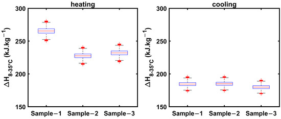 To select a suitable temperature interval, Tan et al. [37] and Stanković et al. [44] implemented a flexible temperature interval condition during data treatment, where is the minimum allowed temperature interval. A similar condition is used in the current paper to scope for reference and PCM temperature intervals. As suggested by D’Avignon et al. [35], the absolute value of the temperature difference, , is considered to capture the supercooling behavior of the PCM.
