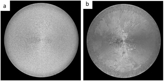 Macrostructure of billet 2 with grain refiner added during casting (60 ppm TiB2), with samples taken from the beginning (a) and the end (b) of the billet.