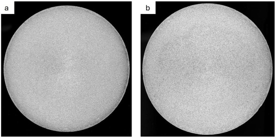 Macrostructure of billet 3 with grain refiner added during casting (80 ppm TiB2), with samples taken from the beginning (a) and the end (b) of the billet.