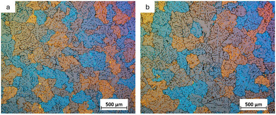 For a detailed analysis of the grain size, microstructural observations of the billets were carried out after etching with Barker’s reagent. The results of these observations are shown in Figure 4, Figure 5, Figure 6 and Figure 7.