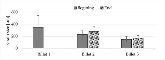 Average grain size at the beginning and end of the billet.