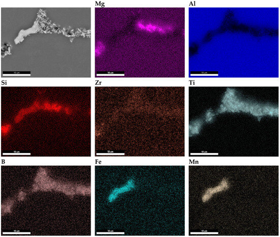 Clusters of metallic compounds other than the naturally occurring phases in the alloy were observed along the grain boundaries. The elemental distribution maps reveal local enrichments of Zr, Ti, and B in regions containing iron-rich phases (AlFeMnSi) and Mg2Si phases, which are naturally present in this type of alloy (Figure 8).