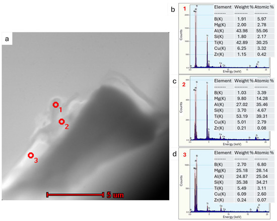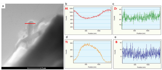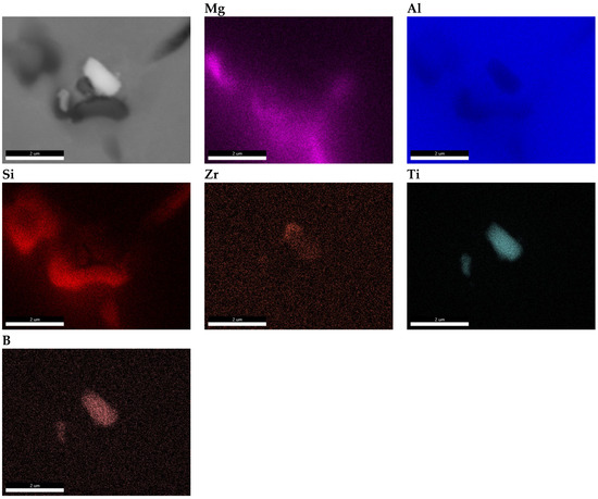 Transmission electron microscopy analyses revealed a small proportion of phases containing TiB2 particles at the boundary. From the observation of the area where particles containing elements such as Ti, B and Zr were found, point and linear micro-area chemical analyses and elemental distribution maps were carried out (Figure 10, Figure 11 and Figure 12). The point chemical composition analyses show that the particle containing Ti and B (Figure 10) also has an elevated Zr content. The analysis in the surroundings of the Mg2Si phase, especially at point 3 (Figure 10c), revealed trace amounts of Ti and Zr. Linear analysis across the TiB2 particle confirmed the presence of Zr (Figure 11). Slight increases in Zr intensity (Figure 11d) were observed at the beginning and end of the particle, in line with the Ti intensity profile (Figure 11c). The B profile (Figure 11e) was characterised by similar small intensity peaks, but the B intensity decreased in the inner part of the particle. The elemental distribution maps (Figure 12) confirm the presence of TiB2 particles in the form of 2 to 3 μm rods deposited near the Mg2Si phase.