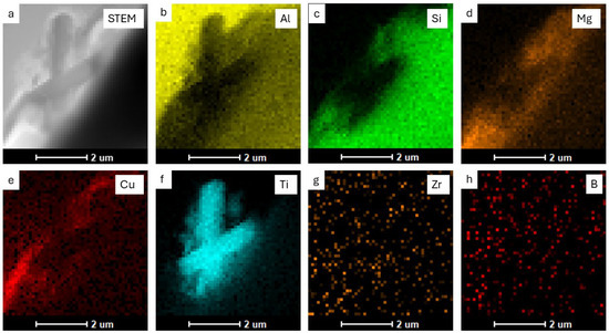 STEM image (a) of the particle area together with elemental distribution maps of (b) Al, (c) Si, (d) Mg, (e) Cu, (f) Ti, (g) Zr, (h) B.