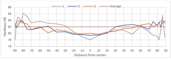 Brinell hardness measurements (Figure 13) revealed that billets 2 and 3 exhibited a stable hardness distribution (±2 HB), whereas billet 1 showed greater fluctuations (±4 HB), which can be attributed to its inhomogeneous structure.