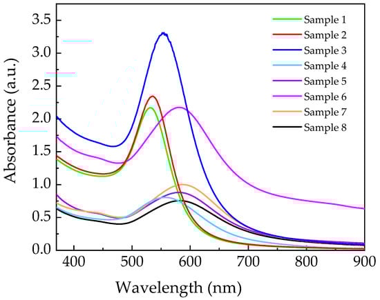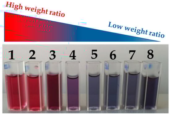 As visible in Figure 1, eight different samples were obtained, with a color shift from red to blue, by varying the weight ratio, R, from 1.29 to 0.51. It is well known that this typical optical property of metal nanoparticles, named Surface Plasmon Resonance (SPR), is strictly dependent on the shape and the size of the nanoparticles.