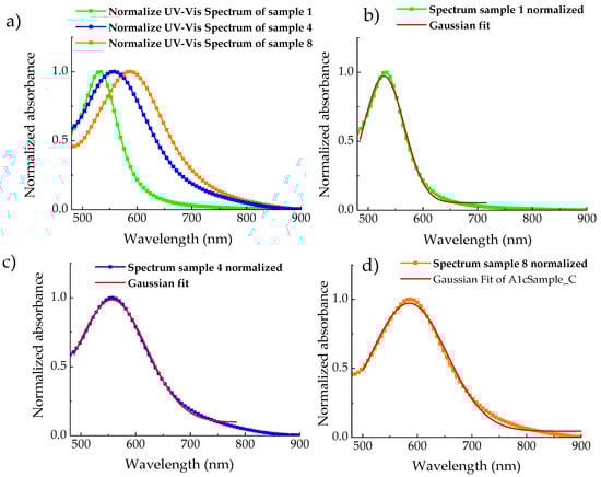 All spectra were normalized to maximum values in the range from 450 to 900 nm and fitted with a Gaussian curve to better evaluate the λm position. In Figure 3, for greater clarity, only spectra of sample 1, sample 4, and sample 8 are shown.