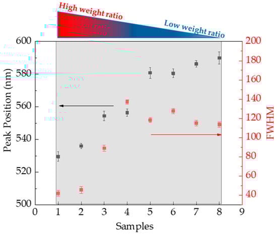 Accordingly, Figure 4 summarizes the behavior of the peak position of SPR, λm, and the full width at half maximum (FWHM), obtained through the Gaussian fit of the optical spectra. As the weight ratio R decreases from sample 1 to sample 8, λm shifts to higher wavelengths, from 530 nm to 590 nm (see black squares and line in Figure 5). Similarly, the FWHM increases from 25 to 140 as R decreases from sample 1 to sample 4, then stabilizes around 130 (see red circles and line in Figure 5). These trends indicate that small, monodisperse Au nanoparticles were obtained with a stoichiometric amount of L-aa, whereas larger nanoparticles with irregular shapes formed at higher concentrations.