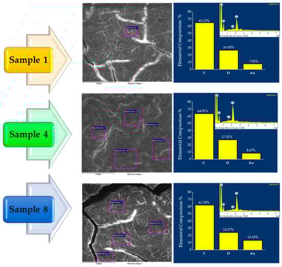 SEM micrographs and corresponding EDS elemental analysis of samples 1, 4, and 8. Each image indicates the area where EDS was performed. The elemental composition is presented as bar charts showing weight percentages of C, O, and Au. Inset: representative EDS spectra for each sample.