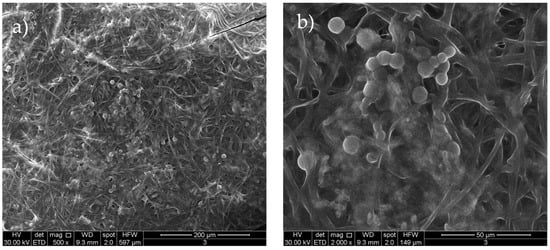 Representative SEM images of sample 3 (see Figure 6) are shown to highlight the composite nature of the hybrid system. The SEM images clearly reveal the presence of spherical nanoparticles, attributable to AuNPs, embedded within a polymeric matrix. Unfortunately, due to their similar morphology and low contrast in SEM, the GO sheets cannot be distinguished from the surrounding PVP matrix.