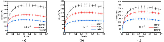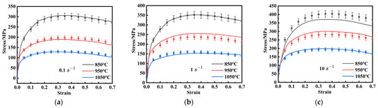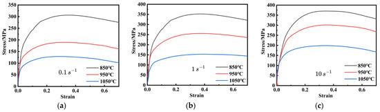The curves of true stress-strain of FeCrAl alloy at the temperatures of 850 °C–1050 °C at the strain rates of: (a) 0.1 s−1; (b) 1 s−1; (c) 10 s−1.