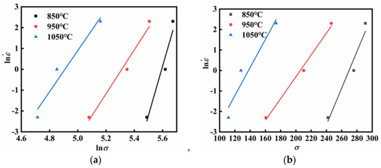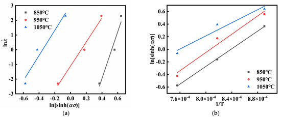 where the symbol represents the strain rate, σ represents the flow stress, and Q (J/mol) represents the thermal activation energy of deformation, which characterizes the energy barrier that the material must overcome during hot deformation. R is the universal gas constant, with a value of 8.3145 J/(mol K). T denotes the absolute temperature in Kelvin (K). And α (MPa−1) is an adjustable constant, reflecting the influence of stress level on deformation. And n is the stress exponent, indicating the degree to which stress affects the strain rate. A is the structural factor, which reflects the influence of the material’s structural characteristics under specific deformation conditions on the deformation behavior.
