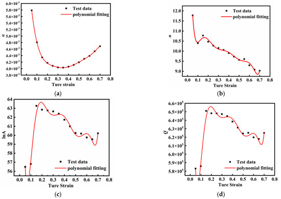 The linear fitting curves of material constants, activation energy with strain obtained through fifth-order polynomial: (a) ; (b) ; (c) ; (d) .