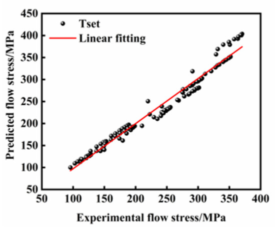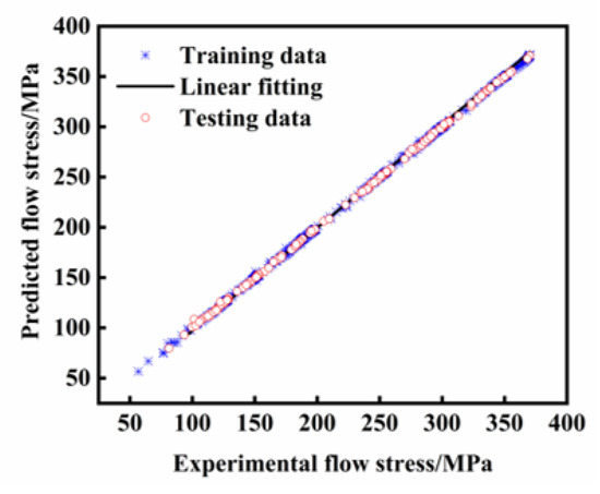 As illustrated in Figure 11, the abscissa represents experimentally determined true stress values obtained through hot compression tests, while the ordinate displays predicted stress values, with the data points closely distributed along the optimal fitting line, demonstrating superior predictive capability. The Rs for both the training and testing datasets were calculated as 0.9936 and 0.9978, respectively. Furthermore, the AARE values derived from the training and testing sets reached 0.37% and 0.39%, accompanied by the RMSE magnitudes of 0.9634 MPa and 1.0481 MPa, respectively. The minimal discrepancies observed in both operational modes substantiate the ANN model’s exceptional predictive accuracy during both the parameter optimization and validation phases.