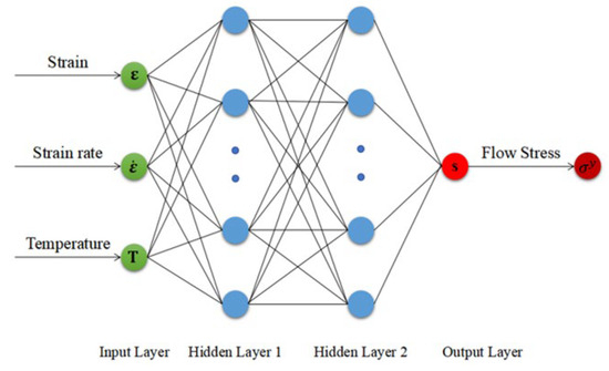 With the advancement of computer technology, artificial neural networks (ANN) have emerged as a powerful tool for developing material constitutive models, thanks to their remarkable nonlinear data processing capabilities [26]. Unlike phenomenological models, which require presupposing a mathematical–physical expression to determine material parameters in constitutive models, ANN models directly learn from data. This data-driven approach enables ANN models to achieve higher efficiency and accuracy in establishing material constitutive models. A number of studies have successfully applied ANN models to construct flow stress models for high-entropy alloys [27] and stainless steels [28,29,30]. Furthermore, comparisons of their predictive performance with that of the Arrhenius constitutive model in the hyperbolic sine function form have been conducted. The results indicate that there is an extremely high degree of consistency between the predicted stress values generated by ANN models and the experimentally measured values. This highlights the effectiveness of utilizing artificial neural networks to model the flow behavior of metals and alloy materials.