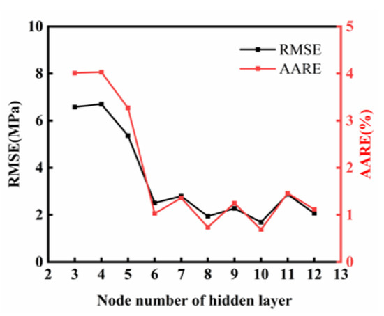 Figure 10 shows how the number of neurons in the hidden layers affects the model’s prediction accuracy. As this number increases, the model’s RMSE and AARE first decrease and then level off. This means the ANN model’s accuracy improves when the hidden layer has six or more neurons. However, beyond this point, further increasing the neurons does not significantly improve performance, indicating diminishing returns. These findings match the empirical rules for optimizing ANN architectures in regression-based predictive modeling.