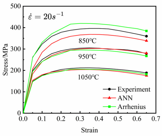 Comparison of predicted stress value of the Arrhenius constitutive model and ANN model with experimental values at 20 s−1 and different temperatures.