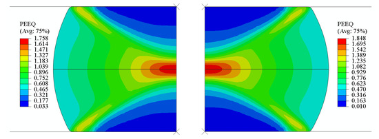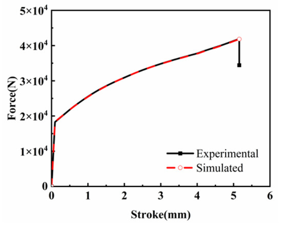 Taking a strain rate of 1 s−1 and a deformation temperature of 850 °C as an example, Figure 15 shows the equivalent strain distribution after hot compression simulations using both experimental data and ANN model predictions. The load–stroke curves were extracted from the finite-element calculation results database, as illustrated in Figure 16. It can be observed that the spatial distribution of the equivalent plastic strain in the ANN simulation results exhibits high consistency with the experimental data, confirming the reliability of the ANN model in the flow stress identification stage.