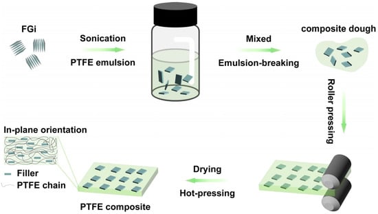 As shown in Figure 1, the preparation of FGi/PTFE composites with different FGi contents involves the following steps: First, FGi powder with the lamellar structure (Figure S1) was dispersed into PTFE aqueous emulsion via 5 min of sonication and 30 s of stirring at 1000 r/min. Subsequently, the composite doughs were prepared by dropping an appropriate amount of ethanol into the above mixtures to demulsify. The dough was repeatedly folded at room temperature and rolled into raw sheets at a linear speed of 1 m/min, followed by drying at 260 °C for 72 h to evaporate the solvent and disperser. Finally, the sheets were densified into FGi/PTFE composite substrates through hot-pressing at 385 °C under 15 MPa for 2 h, with a heating and cooling rate of 5 °C/min. The prepared FGi/PTFE composites were denominated as PTFE-x (x = 0, 0.25, 0.5, and 0.75), where “x” denotes the content of FGi (0, 0.25, 0.5, and 0.75 wt%) in the corresponding substrates.