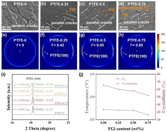 Cross-sectional SEM images of FGi/PTFE composites with FGi loading of 0 wt% (a), 0.25 wt% (b), 0.5 wt% (c), and 0.75 wt% (d), 2D WAXS patterns of FGi/PTFE composites with FGi loading of 0 wt% (e), 0.25 wt% (f), 0.5 wt% (g), and 0.75 wt% (h), XRD patterns (i), Tm and crystallinity derived from DSC curves (j) of FGi/PTFE composites.