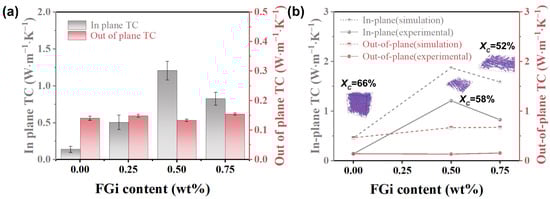 The in-plane and out-of-plane TC of PTFE composites with different FGi contents are shown in Figure 3a. As the FGi content increases, the in-plane TC increases from 0.14 for pure PTFE to 1.21 W·m−1·K−1 for PTFE-0.5, and then decreases to 0.47 W·m−1·K−1 for PTFE-0.75. Meanwhile, the out-of-plane TC remains almost stable. In order to analyze the effect of molecular orientation and crystallinity on TC, EMD simulations based on the Green–Kubo method are used to calculate the TC of PTFE with various orientations and crystallinities. The models for various orientation degrees and crystallinity are shown in Figure S4, and the corresponding TC for each model is shown in Figure 3b. It is well known that the phonon transport efficiency in molecular chains determines the TC of polymers [20]. The oriented arrangement reduces the disordered entanglement among the molecular chains and increases the mean free path of phonons, thereby significantly enhancing the TC [17,19]. Therefore, the introduction of FGi enhances the in-plane orientation of PTFE molecules, leading to a rapid increase in the in-plane TC of PTFE-0.25 and PTFE-0.5. When the FGi content increases to 0.75 wt%, the reduced crystallinity leads to an increase in phonon scattering in the amorphous region, which results in a decrease in TC [37]. These phenomena align with the varying trends of in-plane TC observed in different models presented in Figure S5, indicating the synergistic effect of crystallinity and orientation degree on the enhancement of TC.