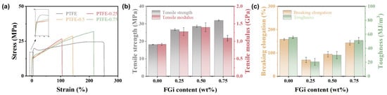 Stress–strain curves (a), tensile stress and modulus (b), breaking elongation and toughness (c) of FGi/PTFE composites.