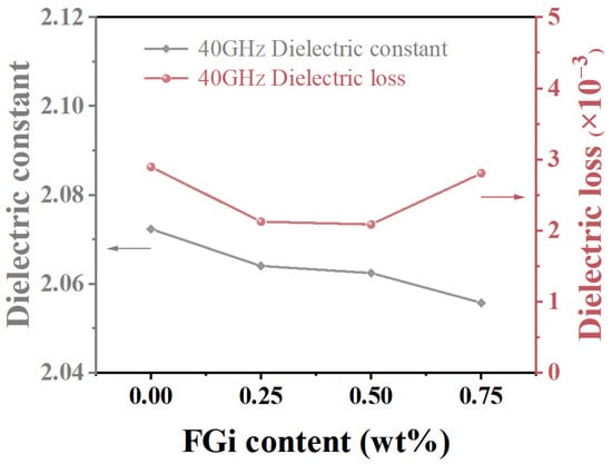 For the substrates applied in the high frequency, the dielectric properties, including the dielectric constant and dielectric loss, are of great concern [40,41,42,43]. Figure S6 shows that the dielectric constant of the composites remains stable across frequencies from 5 to 40 GHz, indicating a highly symmetric internal structure. Meanwhile, the dielectric loss increases with frequency, which is attributed to enhanced ionic conductivity at high frequencies. As shown in Figure 5, the dielectric constant of the composites decreases with the increase in FGi content, which is due to the decrease in crystallinity of the PTFE matrix [36,44]. The dielectric loss of the composites first decreases and reaches a minimum of 0.0021 at PTFE-0.5, and then increases. The decrease in dielectric loss is initially caused by the reduced crystallinity of the composites. However, in PTFE-0.75, the aggregation of FGi sheets forms pores within the composite, which results in an increase in dielectric loss (Figure S7). The PTFE-0.5 exhibits a lower dielectric constant and dielectric loss (2.06, 0.0021@40 GHz) than pure PTFE (2.07, 0.0029@40 GHz), demonstrating its excellent dielectric properties.