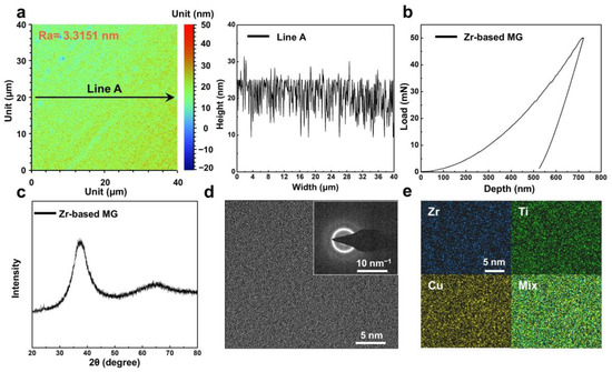 The microstructure of Zr-based metallic glass (MG). (a) Roughness distribution map and corresponding linear distribution plot of Zr-based MG surface. (b) Typical nanoindentation load–displacement curves of Zr-based MG. (c) X-ray diffraction (XRD) pattern of Zr-based MG. (d) High-resolution transmission electron microscopy (HRTEM) image and corresponding SAED pattern of Zr-based MG and corresponding energy-dispersive X-ray spectrometry (EDS) mapping are shown in (e).