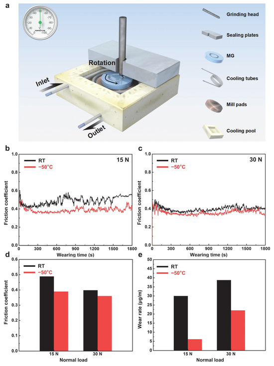 Wear behavior of Zr-based MG in subzero and room temperature. (a) Schematic illustration of low-temperature wear test process setup. The real-time evolution of the coefficient of friction (COF) as a function of sliding time under normal loads of (b) 15 and (c) 30 N. The friction coefficients (d) and wear rates (e) under the various load and temperature conditions.