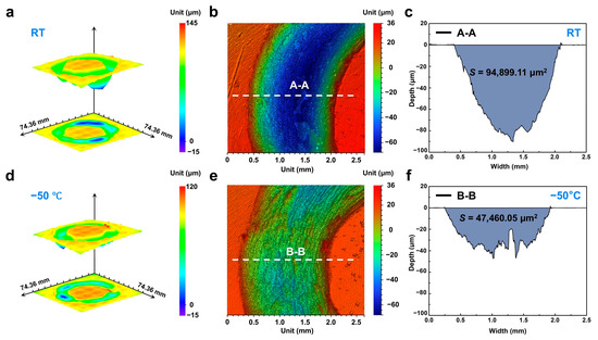An optical 3D imaging system was employed to quantitatively characterize the wear scar morphology. Figure 3a,d show the 3D topographies of the wear tracks generated at −50 °C and room temperature, respectively, over a 7 mm × 7 mm scan area centered on the contact region. It is evident that the room-temperature scars are significantly deeper and more heterogeneous, exhibiting pronounced grooves in localized regions, whereas the scars after subzero temperature are overall shallower and display a more uniform profile. To quantitatively assess scar depth, cross-sectional profiles were extracted from representative areas exhibiting uniform wear (Figure 3b,e). Analysis of these profiles reveals a maximum scar depth of approximately 90 μm at room temperature, compared to only about 40 μm under subzero temperature. By integrating the area under these profiles, the wear cross-sectional area at −50 °C was determined to be 47,460.05 μm2, substantially lower than the 94,899.11 μm2 measured at room temperature (Figure 3c,f). These findings further corroborate the observed reduction in wear rate for the Zr-based MG under subzero temperatures.