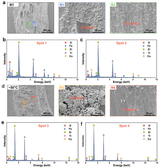 Wear mechanism of Zr-based MG. (a) The wear scar microstructure of Zr-based MG and corresponding magnified images at room temperature. And EDS of the wear debris region corresponding to (b) Spot 1 and (c) Spot 2 in (a). (d) The wear scar microstructure of Zr-based MG and corresponding magnified images at −50 °C. And EDS of the wear debris region corresponding to (e) Spot 3 and (f) Spot 4 in (d).