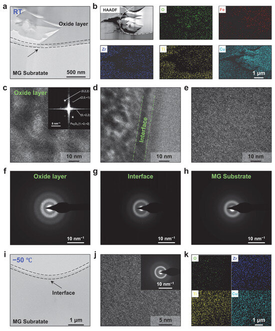 Subsurface analysis of Zr-based MG wear at subzero and room temperatures. (a) The cross-sectional image of the subsurface after room-temperature wear. (b) High-angle annular dark-field scanning transmission electron microscopy (HAADF-STEM) image and EDS elemental maps of the corresponding region. HRTEM images of (c) the oxide layer, (d) the bonding interface and (e) the substrate. Selected-area electron diffraction (SAED) patterns of (f) the oxide layer, (g) the bonding interface and (h) the substrate. (i) The cross-sectional image of the subsurface after subzero wear. (j) HRTEM images of the subsurface (the corresponding SAED pattern is shown in the insert) and (k) corresponding EDS mapping.
