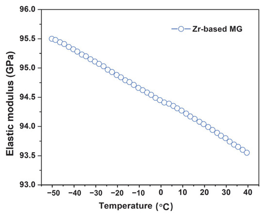 The mechanical properties of the Zr-based MG under low temperature conditions were also evaluated. As shown in Figure 6, the elastic modulus exhibited an approximately linear increase as the temperature decreased from room temperature to −50 °C, reaching a maximum value of 95.5 GPa at the lowest temperature. This trend is primarily attributed to the strengthening of atomic bond interactions [52,53]: at lower temperatures, the thermal energy of atomic vibrations decreases, reducing the amplitude of atomic displacements from equilibrium positions. This results in tighter atomic bonding and, consequently, an increase in the elastic modulus [54].