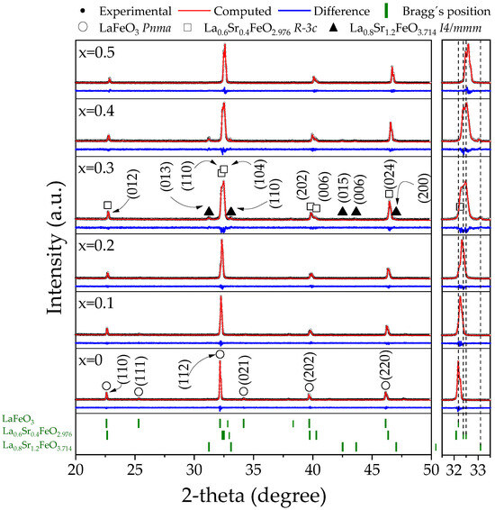 X-ray diffraction (XRD) patterns and Rietveld refinement results of the La1−xSrxFeO3 from sintered mixtures of La2O3, Fe2O3, and SrO for obtaining La1−xSrxFeO3 with 0 ≤ x ≤ 0.5, Δx = 0.1, are depicted in Figure 1. The analysis of the XRD patterns reveals the successful synthesis of single-crystalline LaFeO3 (x = 0) with orthorhombic structure (COD 96-156-1805, Pnma), assuring that the reaction (1) has been completed, where other phases were not detected. When strontium is added to lanthanum ferrite with a concentration of 0.1 mol a shift in the main peak is observed, located around 32° of 2-theta, towards higher angles, indicative of strontium incorporating into the crystalline structure of the ferrite, causing distortion in the unit cell attributed to the difference between the radii of lanthanum (136 pm) and strontium (144 pm) cations [25]. When the dopant content is increased up to 0.2 mol, the shift in the main diffraction peak is more evident, which is indicative that at this concentration strontium is still soluble in the lanthanum ferrite crystal arrangement.