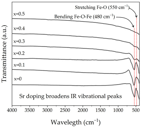 FT-IR spectra of samples prepared by mixing La2O3, Fe2O3, and SrO powders at stoichiometric ratios, milling for 5 h, pressing, and sintering at 1473 K for 4 h for obtaining La1−xSrxFeO3 with 0 ≤ x ≤ 0.5, Δx = 0.1.