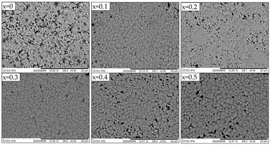 SEM micrographs of the surface of sintered pellets obtained from samples prepared by mixing La2O3, Fe2O3, and SrO powders at stoichiometric ratios, milling for 5 h, pressing, and sintering at 1473 K for 4 h for obtaining La1−xSrxFeO3, with 0 ≤ x ≤ 0.5, Δx = 0.1.