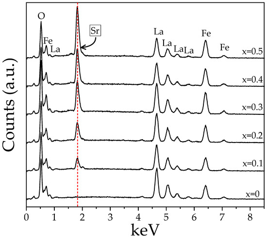 EDS spectra from SEM analyses of sintered pellets obtained from samples prepared by mixing La2O3, Fe2O3, and SrO powders at stoichiometric ratios, milling for 5 h, pressing, and sintering at 1473 K for 4 h for obtaining La1−xSrxFeO3 with 0 ≤ x ≤ 0.5, Δx = 0.1.